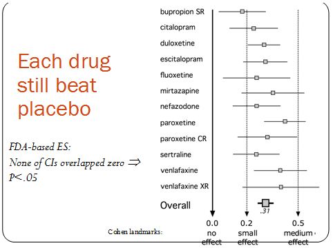 גם אנשי המקצוע ממשיכים להתווכח בנושא הטיפולים התרופתיים. לא בגלל שאנחנו חושבים שהתרופות לא עובדות, אלא בגלל שחלק מעבודה מדעית היא להיות ספקן, ולחשוב מחדש כל פעם על הדברים שאתה מכיר ויודע, ולו רק בכדי לגלות שטעית ואתה יכול לעשות טוב יותר. הייתי שמח אם כולנו היינו מסוגלים לעשות זאת. בכל מקרה, רק כדי להראות לכם עד כמה המציאות מורכבת – אדגים באמצעות מחקר של ד"ר קירש, אביר התנועה נגד התרופות לדיכאון.
